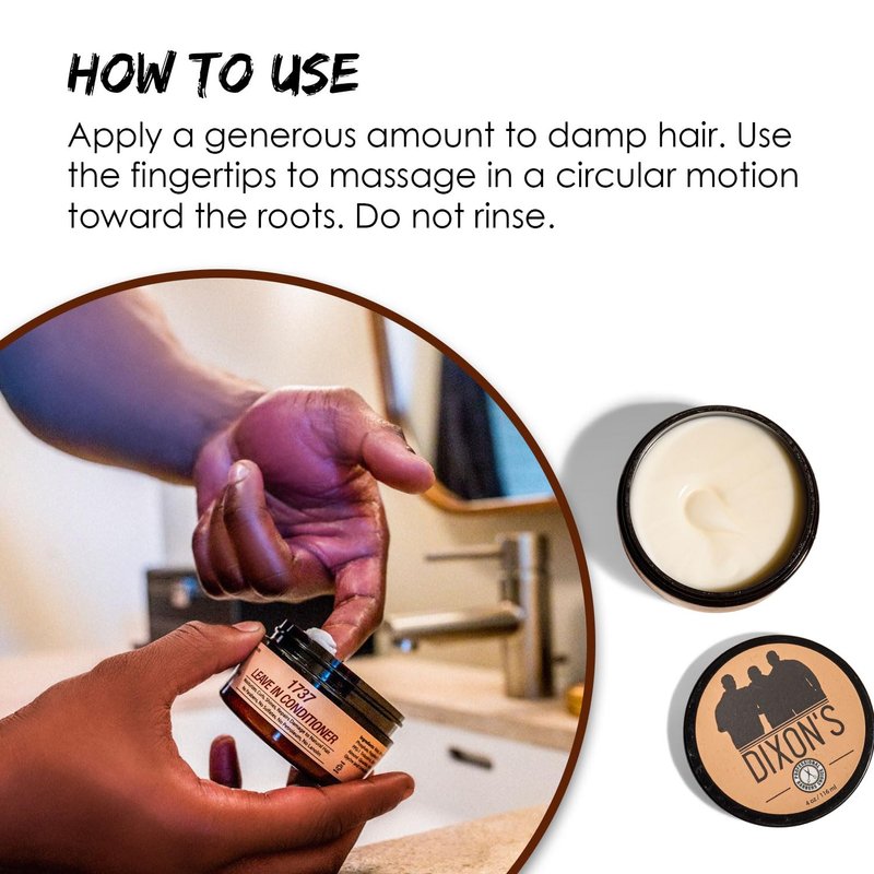 Listen closely and you'll hear it - the whisper of every strand of your hair sighing in contentment. Why? Because they've been introduced to Dixon's Leave In Conditioner. Consider it some daily TLC – made with 34 years of barbering wisdom and sealed with an unbreakable promise of organic ingredients – from us to your hair. This concoction infuses your hair with intense moisture, brings forth the inner bounce of your curls, and repairs the echoes of damage from chemical-based shampoos. The result is nothing short of miraculous – a daily transformation that guarantees a good hair day, every single day. Your hair (and your confidence) will thank you for using Dixon's Leave in Conditioner.
