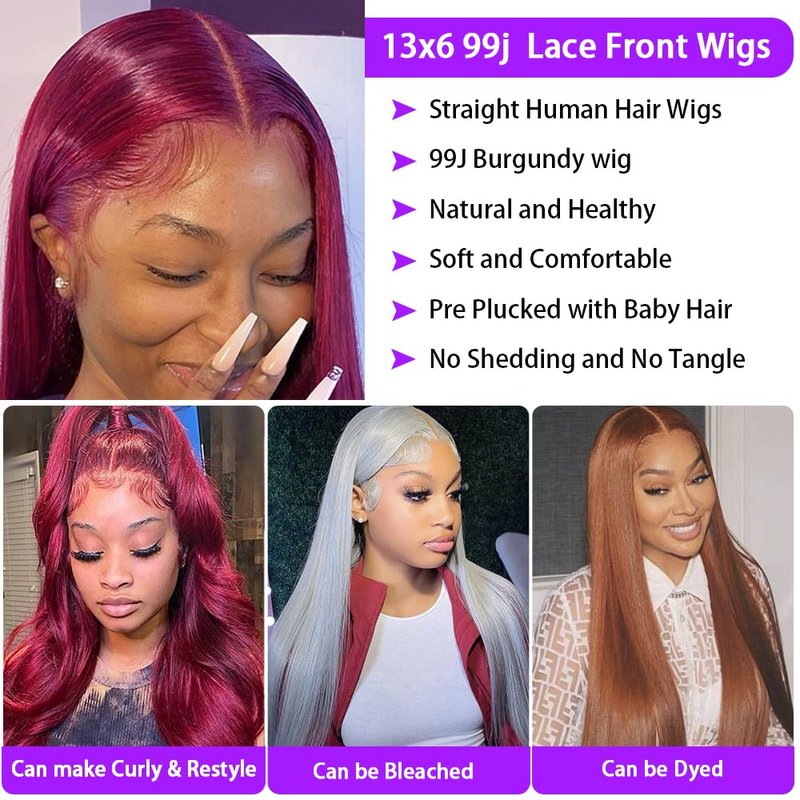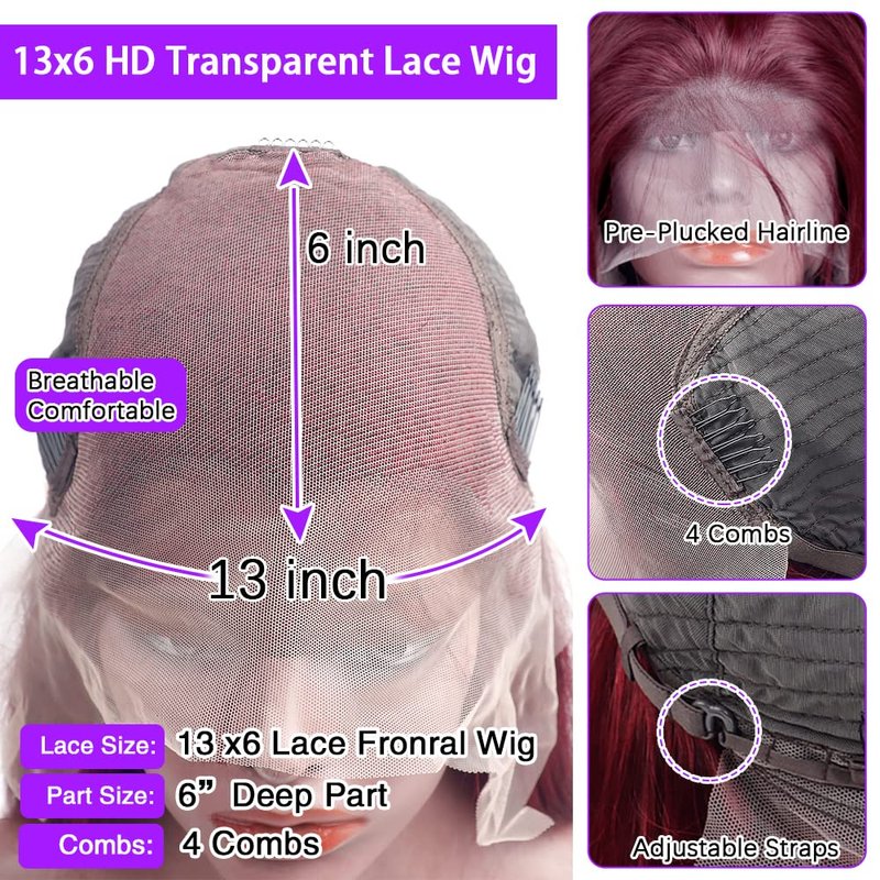 - 🌸【13x6 99j hd frontal wig】: 100% Unprocessed Brazilian Virgin Human Hair,Pre Plucked with Baby Hair, 10A Straight Lace Front Wig, Soft and Comfortable, Natural and Healthy.