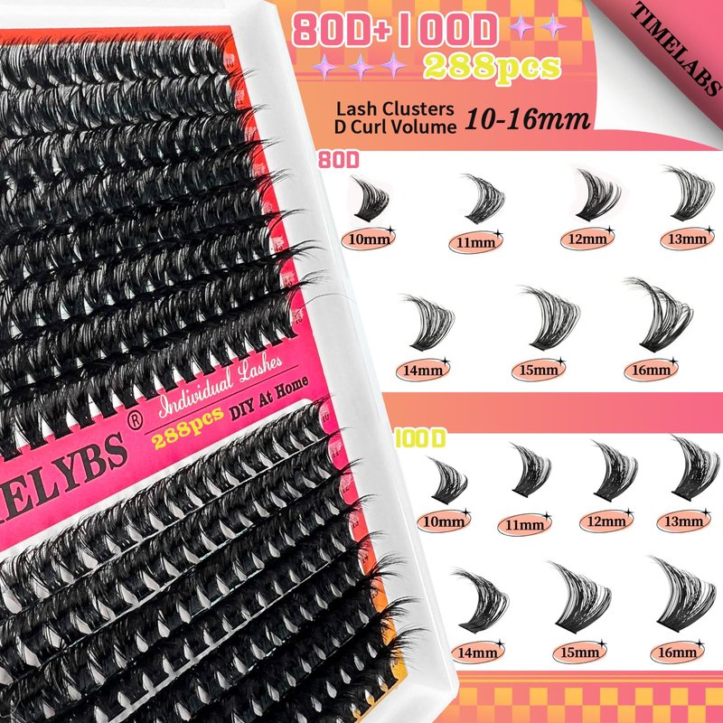 - INDIVIDUAL LASHES CLUSTERS:The eyelash tray has 16 rows in total, including 1 row each of 80D 10MM, 11MM, 12MM, 13MM, 14MM, and 15MM, 2 rows each of 80D16MM, and 1 row each of 100D 10MM, 11MM, 12MM, 13MM, 14MM, 15MM, and 2 rows each of 100D 16MM. Individual lash clusters are easy to apply and gorgeous. It takes less time to complete a cluster of lashes for each eye. Save money and time now compared to salon eyelash extensions.