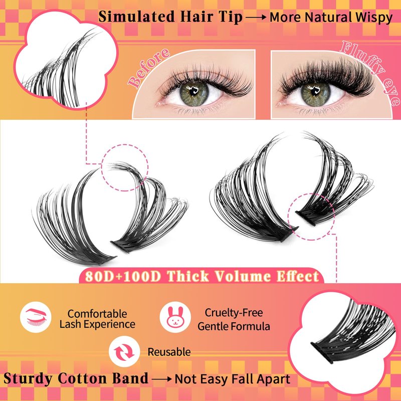 - DIY FLUFFY LASH FOR BEGINNERS: TMIELYBS lash extensions are fluffy, soft, and light. These lashes clusters are made of fluffy technology to ensure softness, durability, beauty, no kink, and don’t fall apart. Make your eyelashes more fluffy volume, making these lashes perfect for beginners!