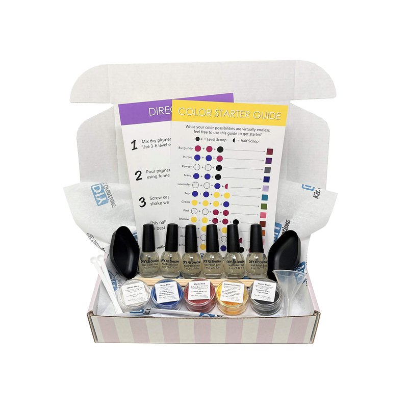 Included is an optional color guide along with a liquid nail polish base pre-bottled in stylish, Italian-made glass nail polish bottles (no mixing or pouring of nail polish base required). Great for DIY-ers, gift-giving, parties, aspiring artists, and more!
