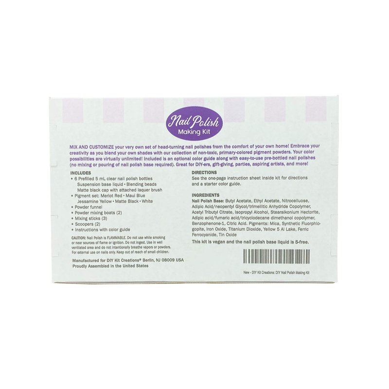 Kit ingredients are vegan and free from Toluene, DBP, Formaldehyde, Formaldehyde Resin, or Camphor. This DIY Nail Polish Kit Includes: