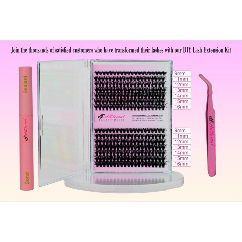 - DIY Lash Extension Kit: AsEternal DIY lash extension kit provides 280 PCS CLUSTER LASHES (30D+40D), LASH BOND AND SEAL *1, LASH APPLICATOR*1 per box. Achieving the perfect extension look has never been easier with AsEternal DIY eyelash extension kit that offers all you need to work with at home. Save time and budget.