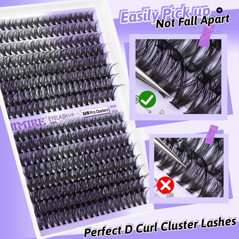 - DIY Lash Extension Kit: Valuable lash clusters kit including 1*320pcs high capacity D curl lash clusters(30D+40D 9-16mmmixed) 1* lash glue bond and remover *1 lash applicator tweezers and 1* lash brush.Buy JIMIRE lash extension kit meet all of your needs to DIY lash extensions at home, beinners friendly