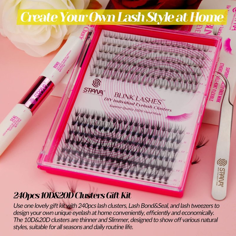 - DIY Eyelash Extension Kit: 240pcs lash extension kit includes everything you need to create your own unique eyelash style, including premium quality faux mink lash clusters D curl, advanced formula strong-hold lash bond and seal, and professional craft clusters individual lashes tweezers.