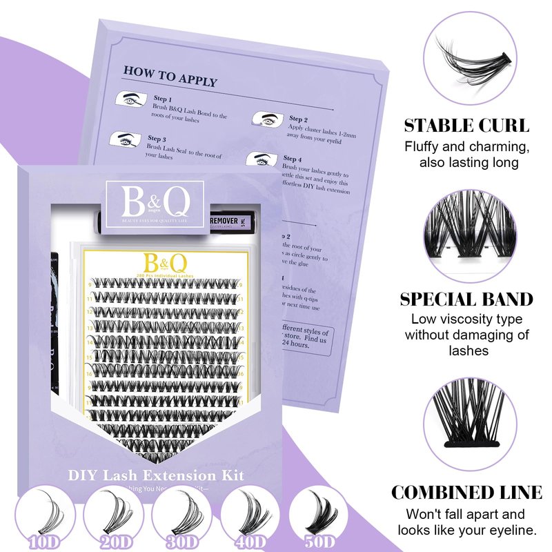 - Great Quality: B&Q cluster lashes in lash extension kit are soft and lightweight, easy to apply even for beginners. Tiny pores on the cluster lashes’ surface to absorb more glue and last longer. Individual lashes in eyelash extension kit have great quality, looks real and natural. You can enjoy applying lashes with this diy lash extension kit.