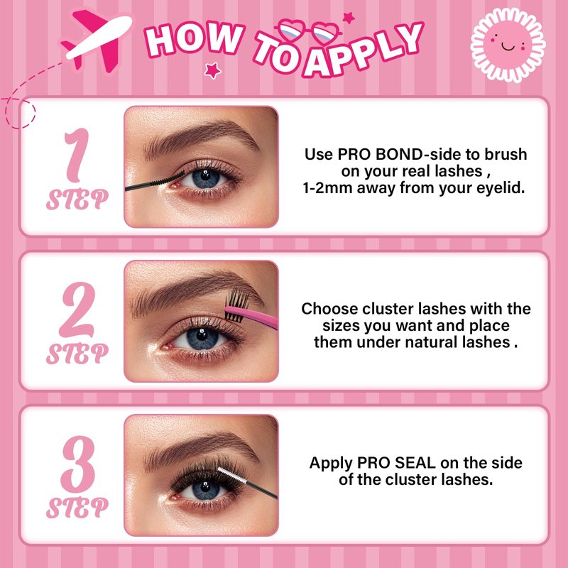 - Use Method: Gently take lashes off the strip by grab them at the root.Use the Bond-Side of PRO Bond and Seal to brush on your natural lashes. 1-2 mm away from your eyelid and wait for 30 seconds. Then apply the cluster lashes underneath your natural eyelashes, away 2-3mm from your eyelid! Brush your lashes with the seal.Finally,you will be happy to start a new day of traveling with the perfect makeup.