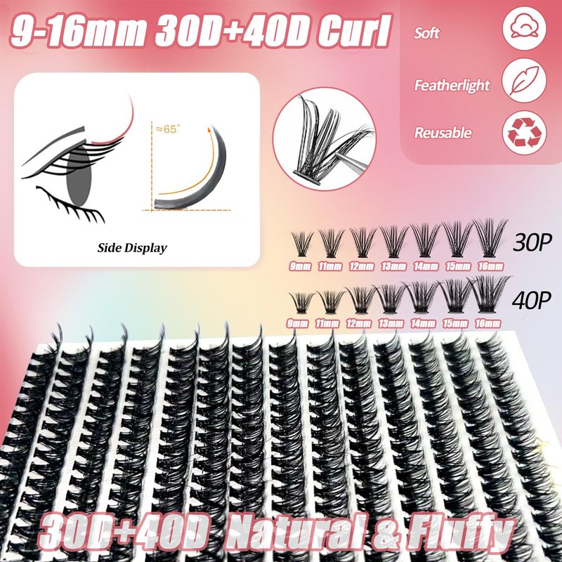 - Cluster Lashes in 9 to 16mm 30D 40D Curl:This cluster shaped false eyelashes are flat and natural,and can fully integrate with your own eyelashes.Due to each person's slight different on eye contours,a single eyelash may be more suitable for each person's situation,making it more personalized compared to the previous striped false eyelashes.And there are multiple lengths from 9 to 16mm for you to choose from,you can create more styles,such as cat eye effect,natural, fluffy,etc.