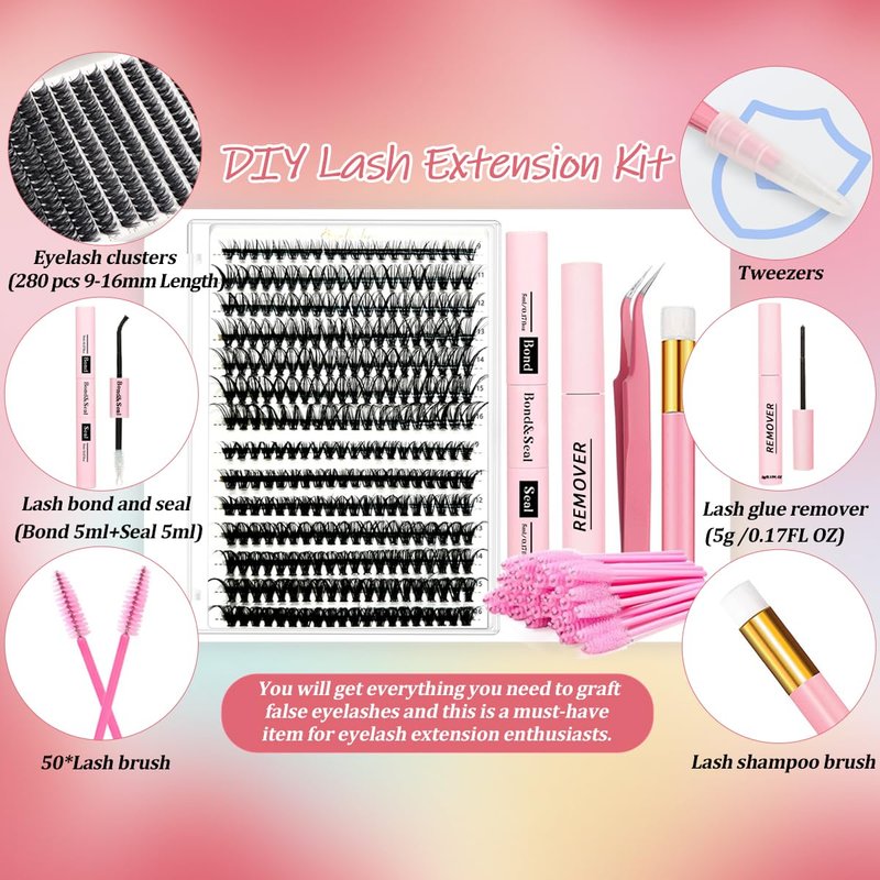 - What Will You Get:DIY eyelash extension kit includes 280 pcs 9 to 16mm length 30D 40D individual eyelash clusters,1 strong hold lash bond and seal (Bond 5ml Seal 5ml),1 lash glue remover 5g,1 tweezers,50 lash brush and1 lash shampoo brush.You will get everything you need to graft false eyelashes and this is a must have item for eyelash extension enthusiasts.