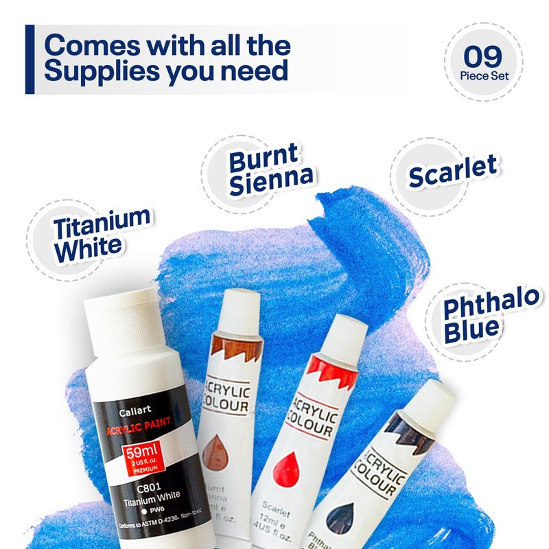 - Comprehensive 9-Piece Acrylic Painting Kit: Our painting kit includes all the materials needed to bring your creativity to life. High-quality acrylic paints, a durable paint palette, a set of brushes, graphite paper, and a canvas panel. Use the exact same materials as the instructor for a seamless, enjoyable painting experience from start to finish.
