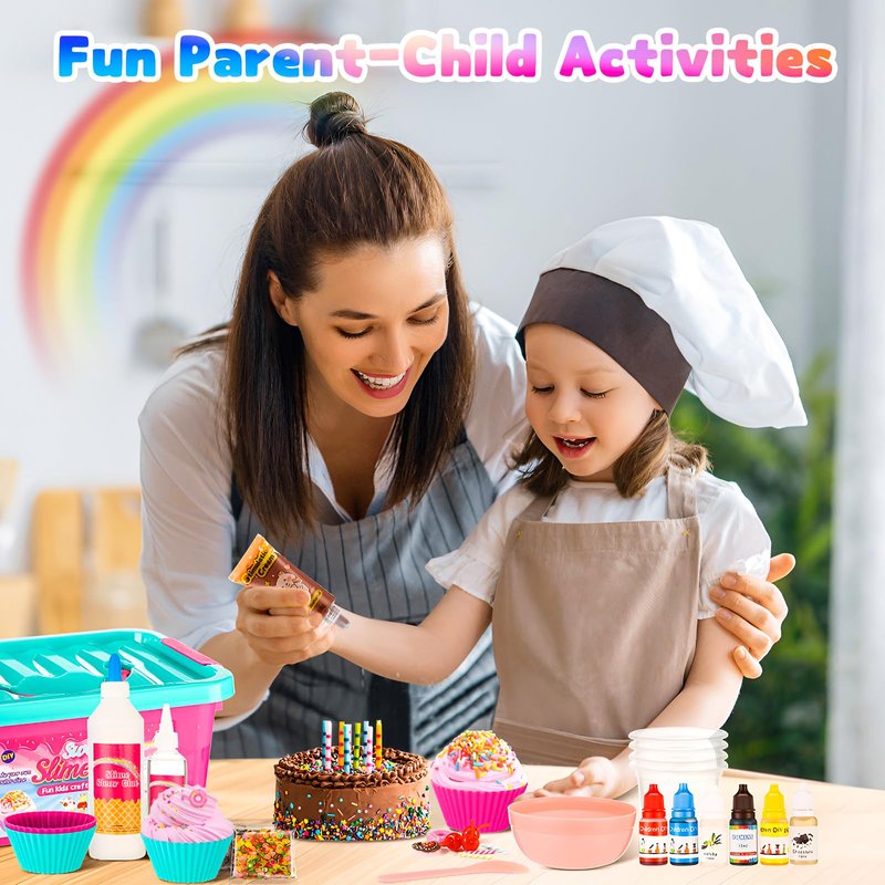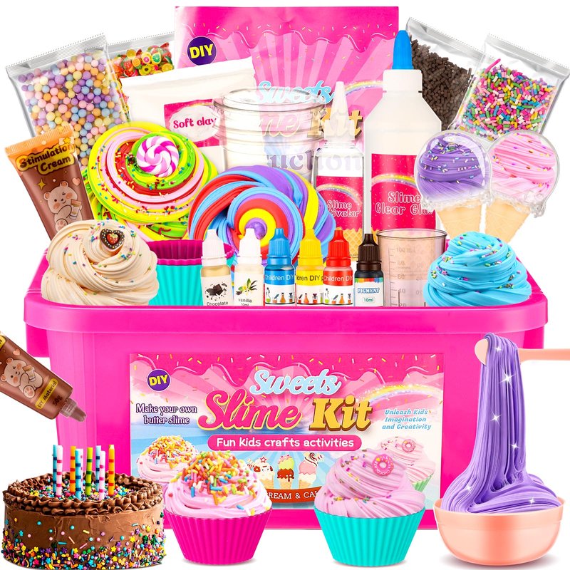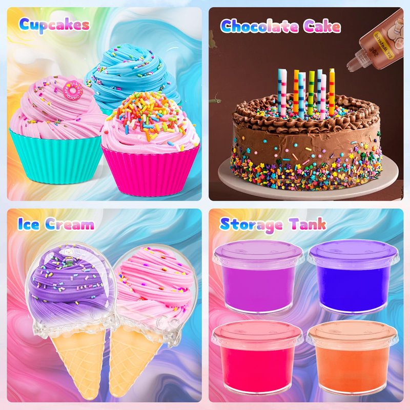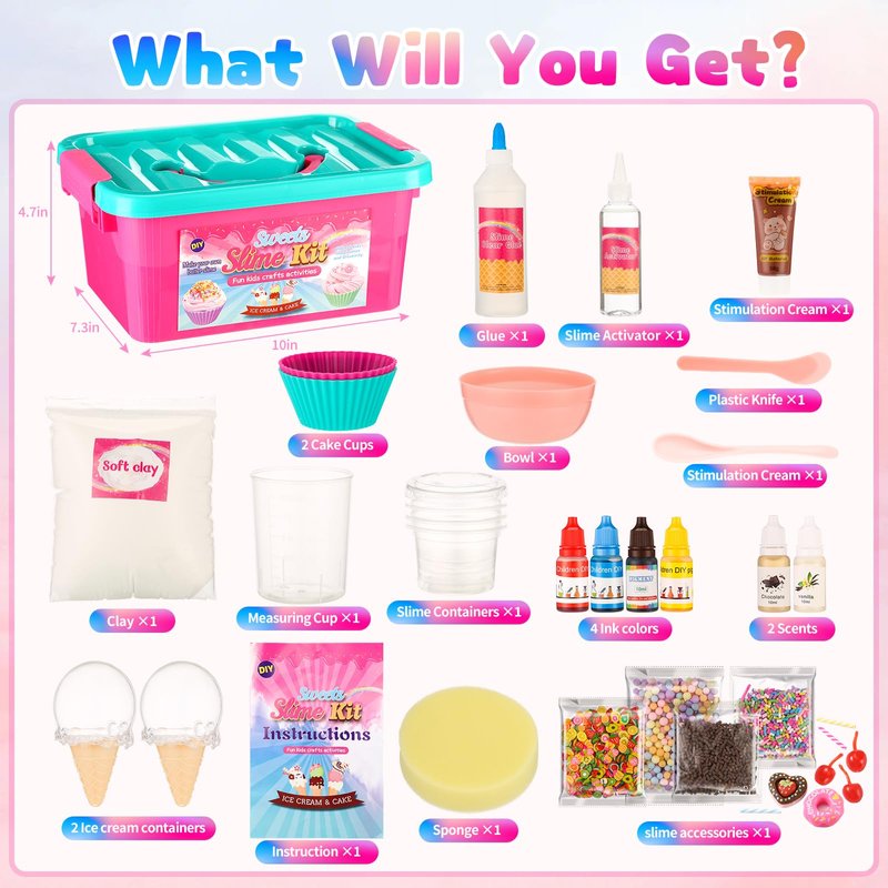 - 【DIY Ice Cream & Cake Butter Slime】 Make your own slime kits for girls 4-6 is fun creativity kids activities. Using the DIY slime kit, you can make your own ice cream and chocolate birthday cake. The process is easy to operate, which can bring endless fun to kids ages 7-12 with this slime pack. Rich slime accessories can create various style slime like fluffy slime, clear slime, butter slime and cloud slime. Let’s us feel slime charms together. Great slime making kit for kids.