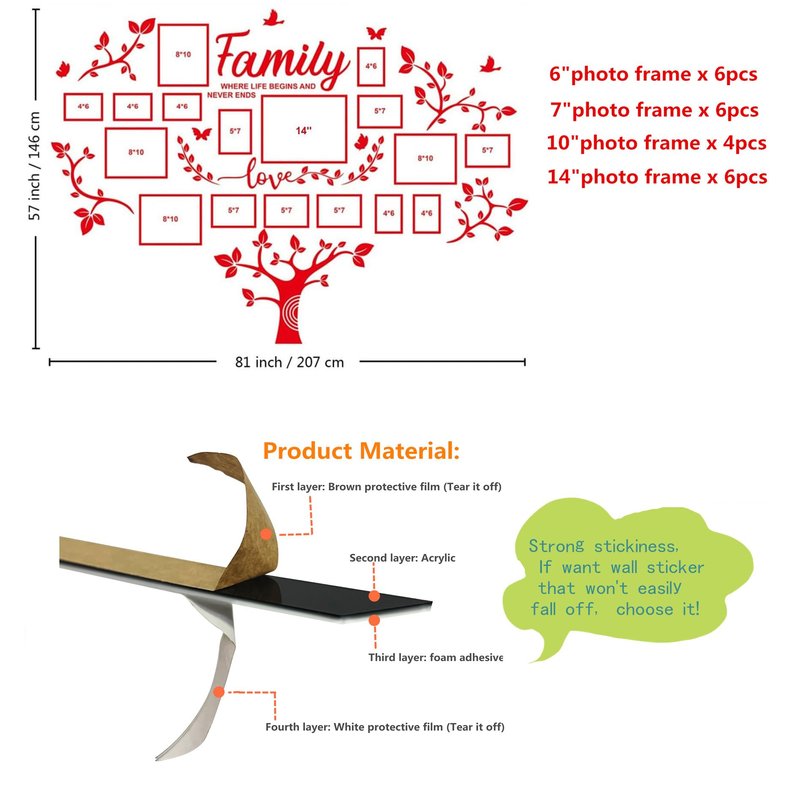 - DIY 3D family wall decor: acrylic, self adhensive, the overall thickness is 1.8mm. There are brown protective film on the product, please tear off the brown protective film, then you will see the real shiny acrylic wall decor. Please use wall sticker on smooth and clean surfaces such as smooth walls, glass, wood panels, etc. The overall dimensions of the tree wall decals: width 81'' and height 57''.