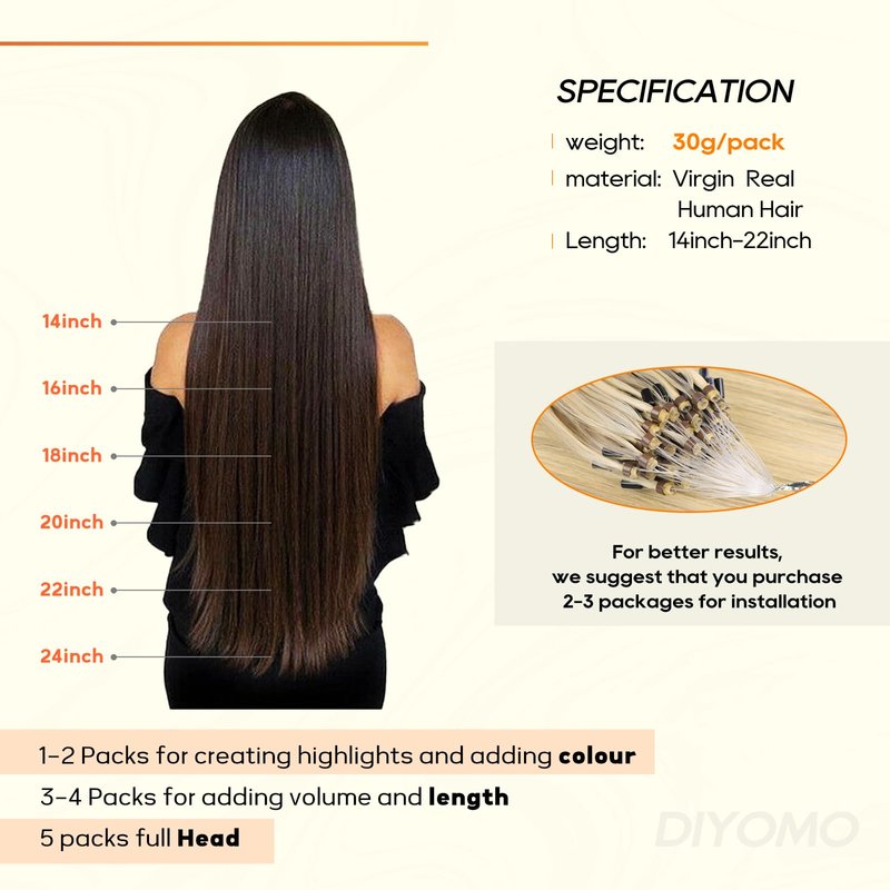 - 【Microlink Extensions】Microlink Hair We recommend going to the salon to install hair extensions for better results, diyomo Microlink Hair Extensions Human hair contains a variety of length designs, 14inchs-22in, each pack weighing 30g. Microlink Extensions We also offer a wide selection of colors and different effects for you to choose from!