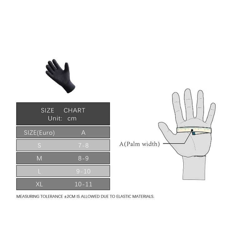 - Hands come in different size. We recommend you to refer to seller size chart to choose a neoprene diving gloves of fittest size. Measuring the width of the palms need you to measure from the part between the thumb and the index finger to the base of the little finger.
