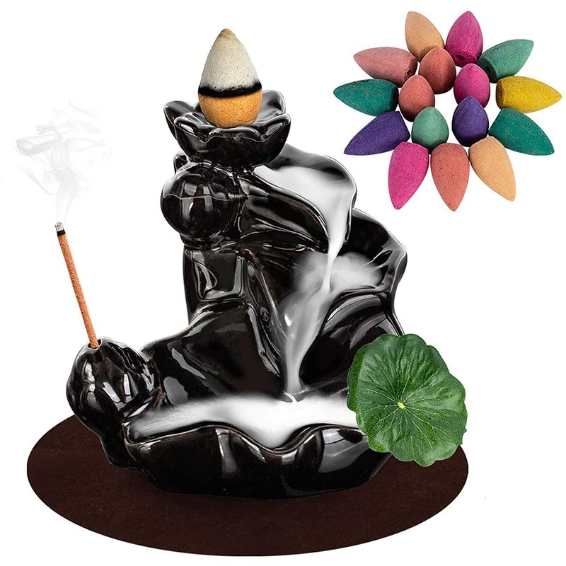 DK177 Waterfall Incense Holder Backflow Cone Ceramic Burner Handcrafted Porcelain Censer Incense Stick Stand with 20 Free Cones