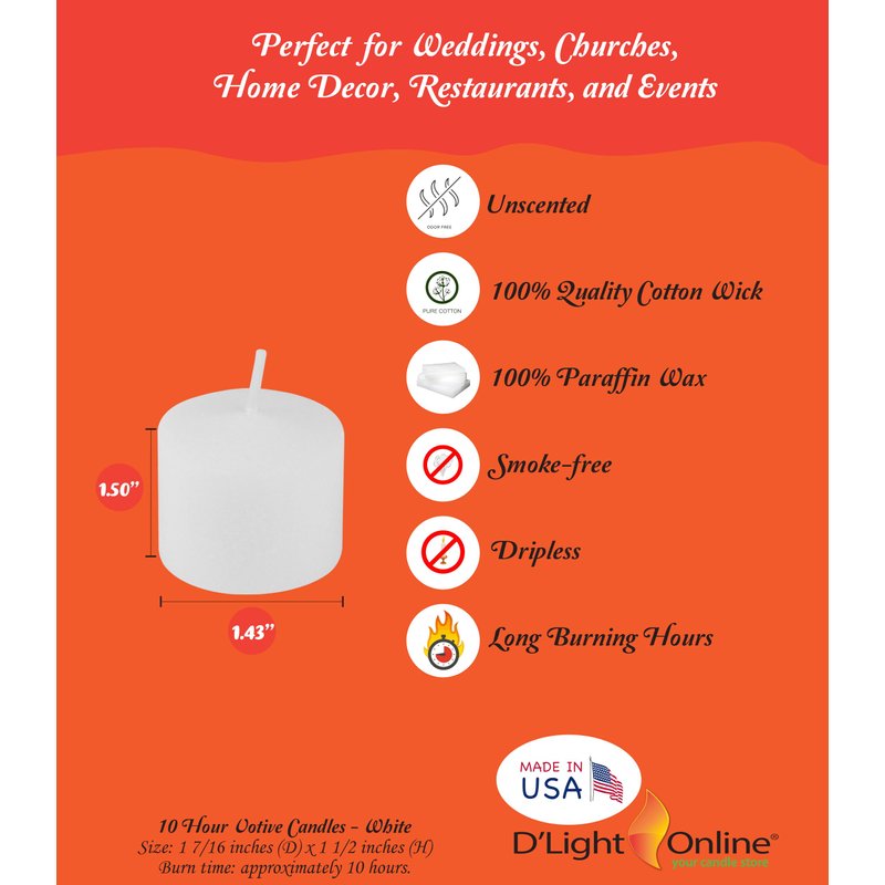 - Size and make; 10 hour votives white set of 12; These votive candles are 1.5 inches in height and 1.43 inches in diameter; Fits most standard candle holders; made in the USA; Carefully packed to prevent damage