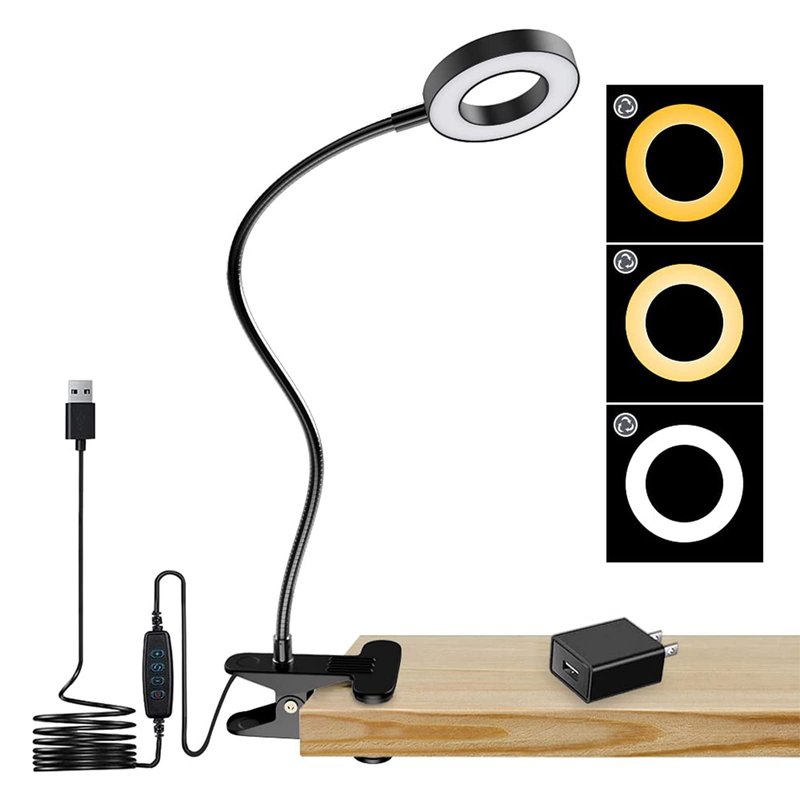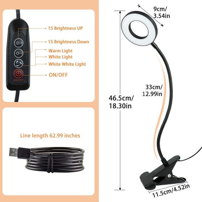 🎅Specifications Wattage: 6W Body Material: Plastic & Aluminum Alloy LED Color: White light, Warm white light, Warm light USB Charging Port: 5V/2A Color Temperature: 3000K ~ 6500K Line Length: 62.99 inch Operating Temperature: -10℃ ~ 50℃ Certification: CE RoHS 3 Color Modes and 15-Level Dimming The LED Clip Lamp provides 3 color modes (White light, Warm white light, Warm light) with 15 dimming levels to ensure you can always get the most suitable light color according to a variety of uses.White light is more suitable for your work, reading or studying, Warm light is very suitable for sleeping or relaxing at night. 360 Angle Adjustable:33cm flexible gooseneck can rotate 360 help you easy to twist and select the light direction you need. USB Plug Design: The clip desk light has an USB cable plug and play! Can be used with most devices that support USB ports to power desk lamps, such as laptops, PCs, power banks, USB chargers, USB sockets, and AC adapters. Scratch-free Metal Clamp Design: The metal clamp can reach to 5.5cm,attaches firmly to any bed headboard, table and edge.Foam pad design provide you scratch-free clamping and protect your furniture. Eye Caring :Made of high LED chips quality, no flicker, no dazzle, help those who read and work hours a day to protect eyesight and reduce eye strain. It is the best choice for reading, studying, working, painting, sewing and so on. NOT: The memory function only works by the button on/off, will be reset when the USB power is off.If the power is not turned off, the clip light will automatically remember the brightness and color mode used last time.