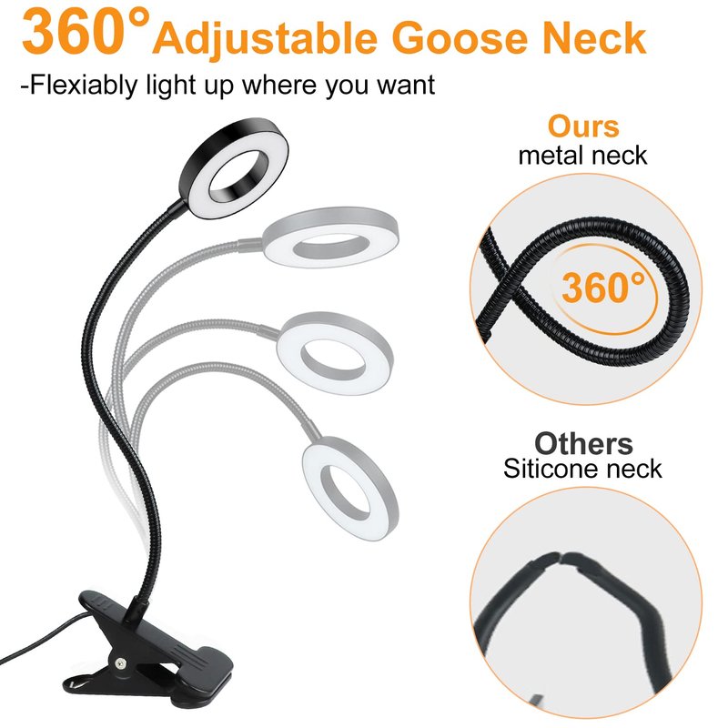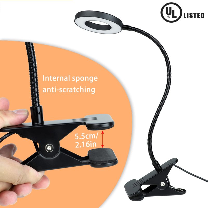 - 🎅【FLEXIBLE GOOSENECK & STRONG METAL CLAMP】 The flexible gooseneck made of high-grade aluminum can be adjusted 360 degrees, and the flexible neck design allows you to place the dimmable desk lamp wherever you want. Sturdy metal clip with anti-scratch pad can be firmly clamped on side table, book, bookshelf, etc.
