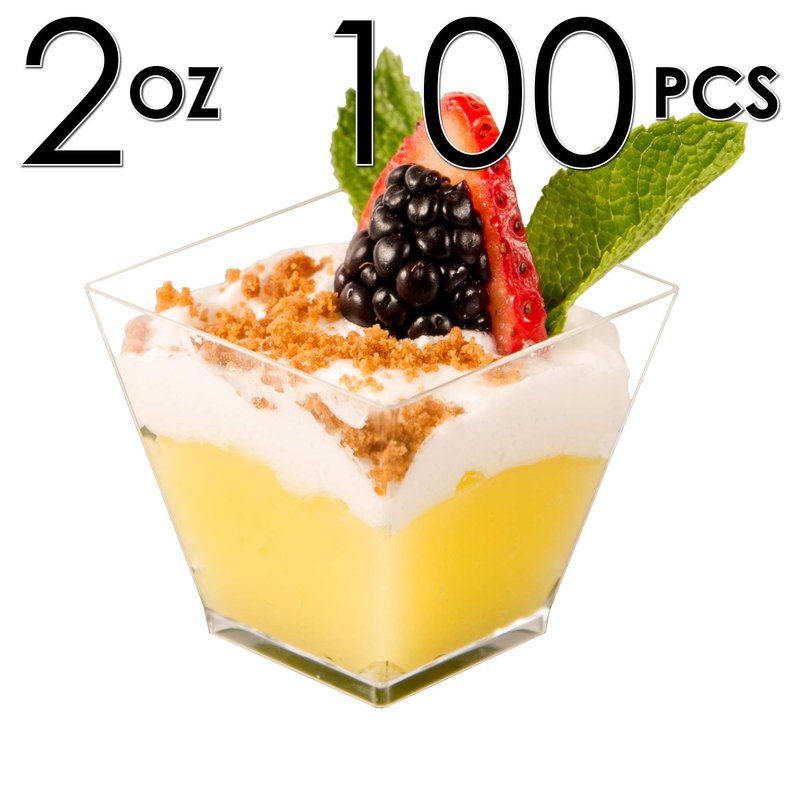 DLux 100 x 2oz Square Mini Dessert Cups (No spoons), Clear Plastic Parfait Appetizer Cup - Small Reusable Serving Bowl for Tasting Party Desserts Appetizers - With Recipe Ebook