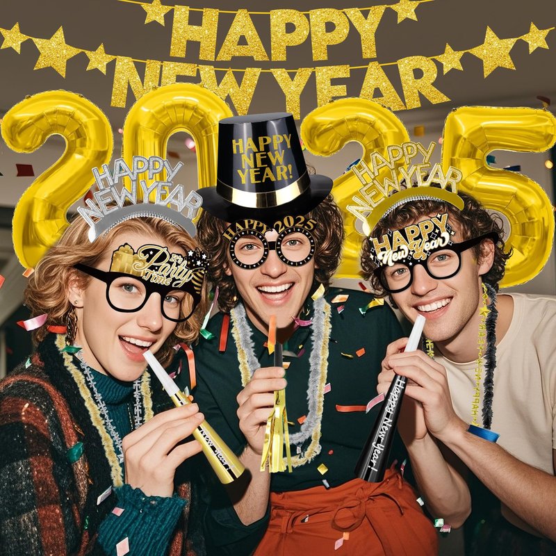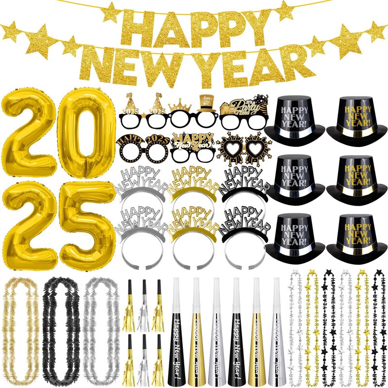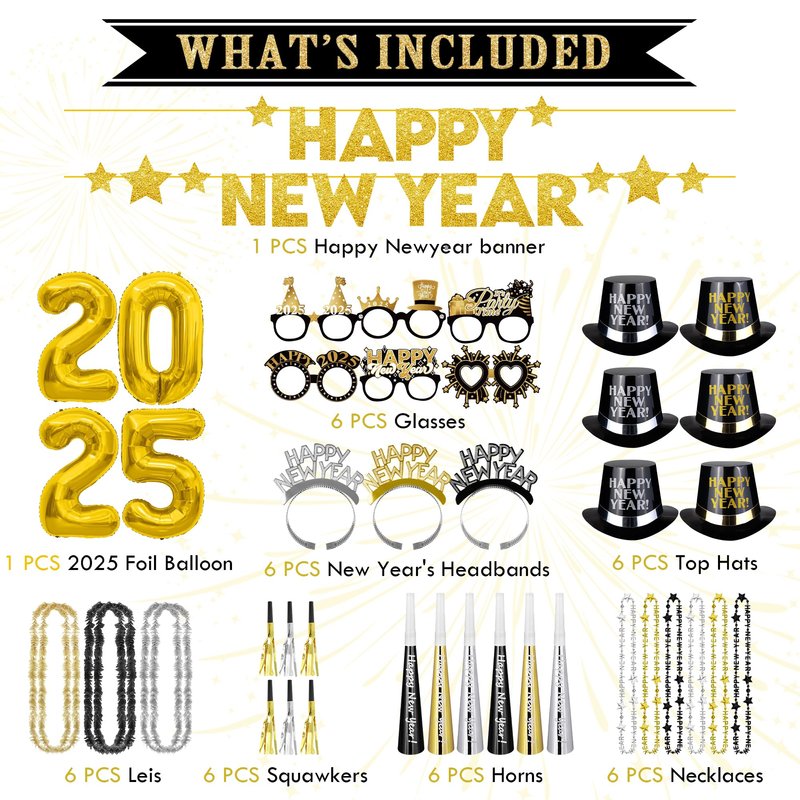 - Package Includes: This 2025 New Years Eve Party Supplies set doubles as both decorations and party costumes, including 32 inch "2025" foil balloons, 1 Happy New Year banner, 6 plastic top hats, 6 New Year's headbands, 6 party horns, 6 squawkers, 6 glasses, 6 leis and 6 necklaces