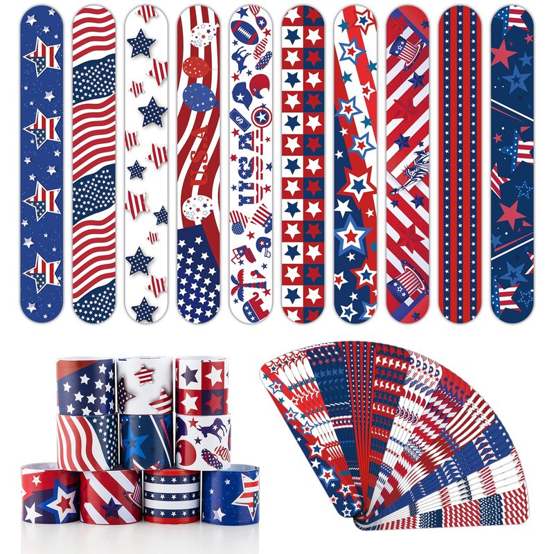 - 【50 PCS Fourth of July Slap Bracelets】The slap bracelets set bag includes 50pcs American flag Slap BraceletPatterns including American flags, Hot air balloons,eagles,Fireworks,Rugby and many other types,everyone is free to choose the pattern they like.