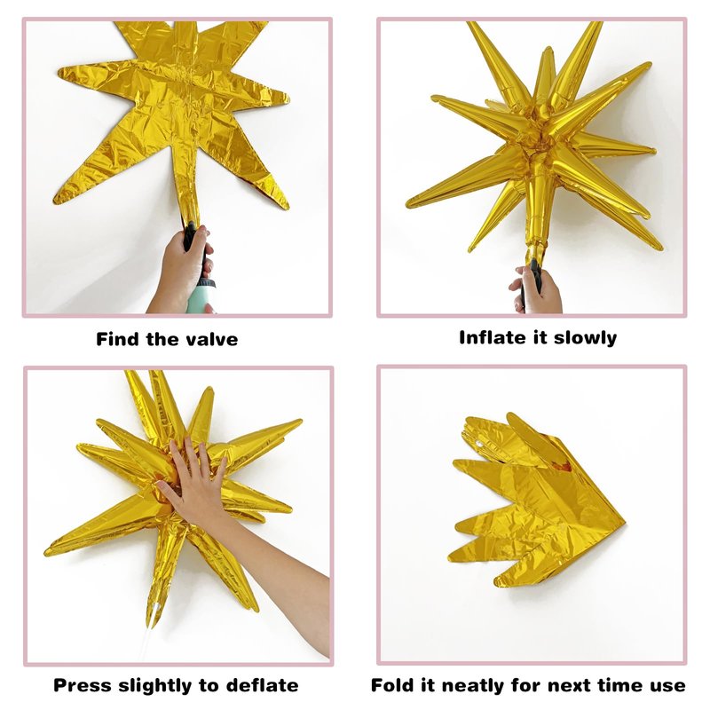 - Easy to Use: Different from others starburst balloons need to assemble,explosion star balloons are one-piece with 14 cones, so you do not have to assemble the cones on by yourself. Only need to use a straw or air pump to inflate the star balloons. There are holes on the top to string, you can string the star balloon with a line and hanging on balloon garland or balloon arch. Also can use dot glue to hang it on the backdrop or where you need. Perfect addition to theme parties celebration.