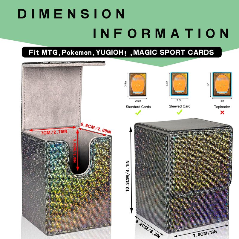 The vertical commander deck box come with 4 ones as a set. They are made of laser PU leather, each one comes with 2 dividers. Each one holds up to 100+ Standard size gaming cards with single sleeves or 180+ sleeveless cards. Fits all standard size trading cards such as football cards, baseball cards, poker cards, game cards, attack cards. Compatible with Magic the Gathering and other standard size card games, YuGiOh! and many more CCG, LCG and all your favorite TCG card games.