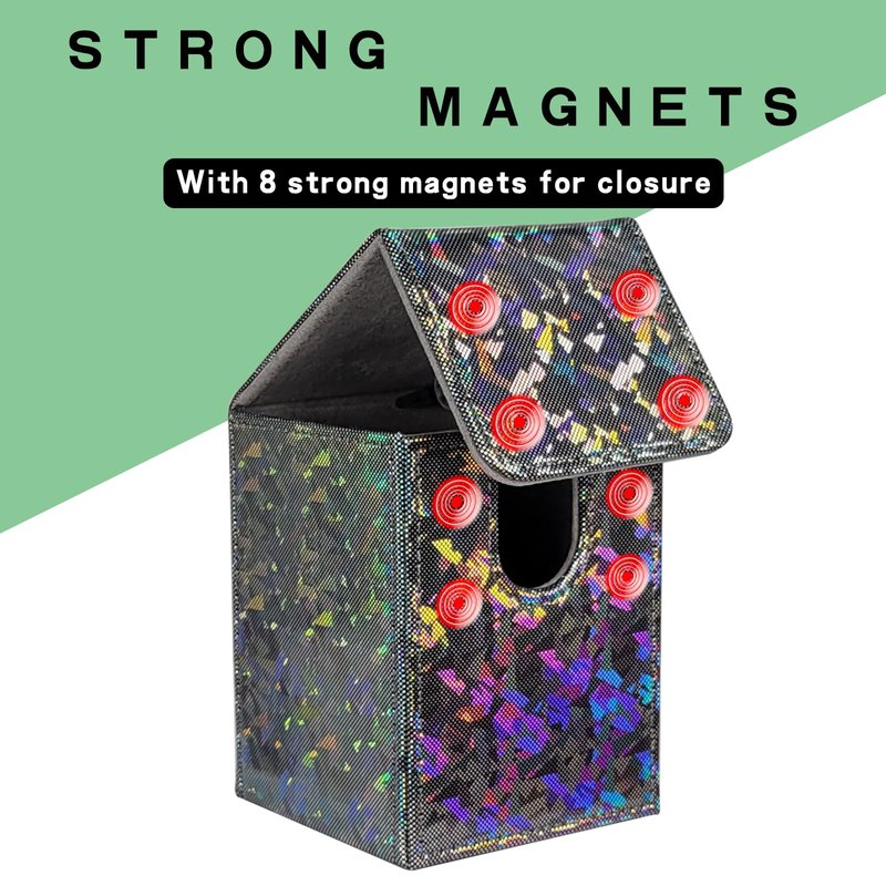 The vertical commander deck box is made of laser PU leather. It comes with 2 dividers. The box holds up to 100+ Standard size gaming cards with single sleeves or 180+ sleeveless cards. Fits all standard size trading cards such as football cards, baseball cards, poker cards, game cards, attack cards. Compatible with Magic the Gathering and other standard size card games, YuGiOh! and many more CCG, LCG and all your favorite TCG card games.