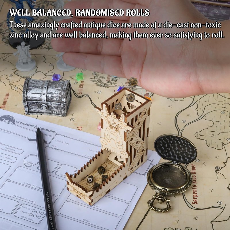 - WELL BALANCED, RANDOMISED ROLLS - These amazingly crafted antique dice are made of a die-cast non-toxic zinc alloy and are well balanced, making them ever so satisfying to roll. Numbers are engraved and painted in black boldface, so they are easy to read.