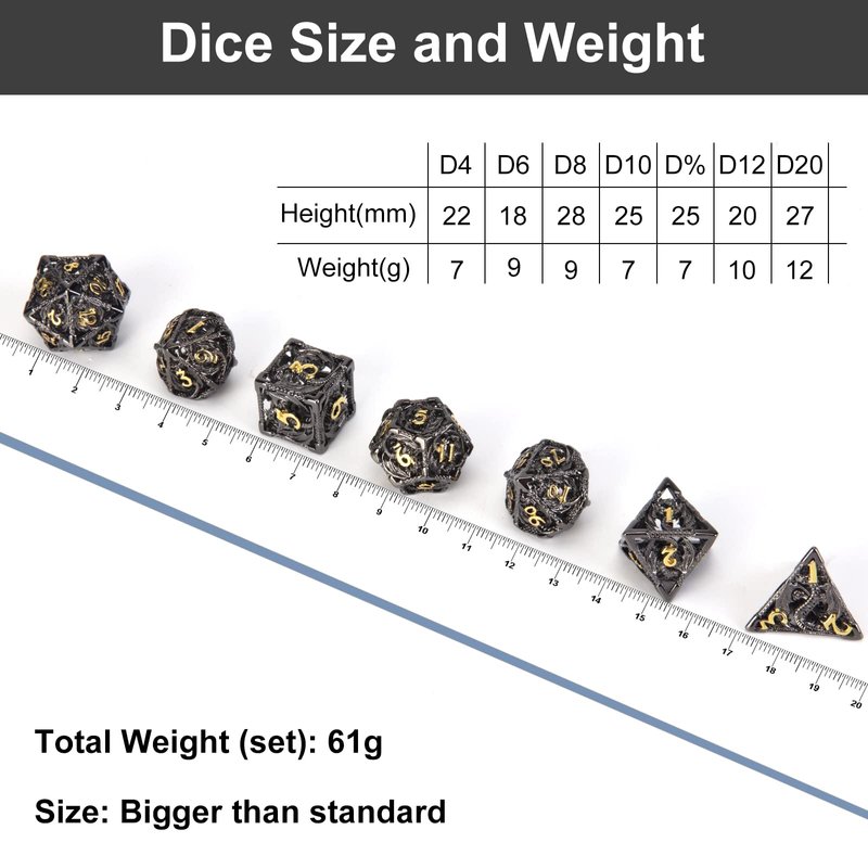 - 4. 【widely used】:Metal dice sets are ideal for role playing games such as Dungeons & Dragons, Pathfinder, Star Search, Warhammer, MTG, and board games. They are perfect for parties, teaching projects, or other group games.