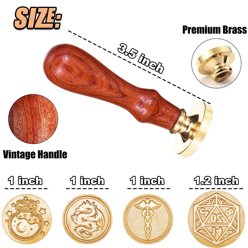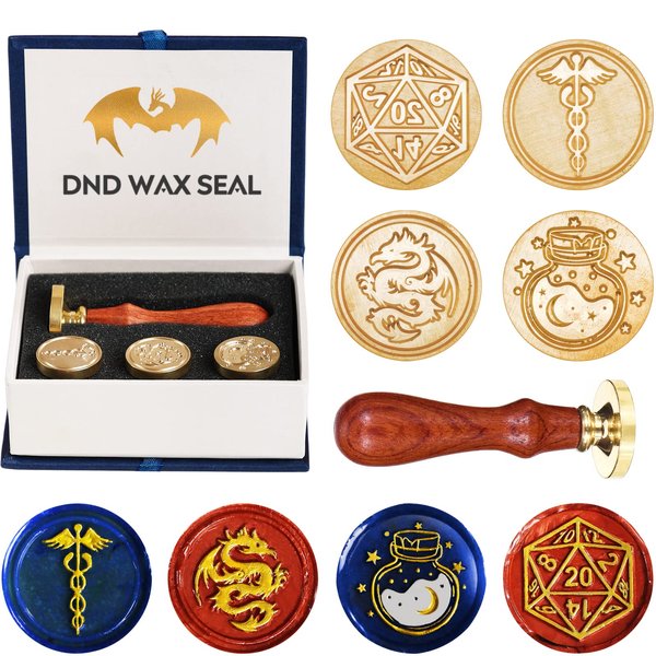 - ★【Designed for Dungeons & Dragons】-- Wunhunew wax seal stamp set is specially designed for Dungeons and Dragons, which includes four embossed patterns(D20 dice, Dragon, Magic potion, Caduceus), so you can apply them on different occasions of DND.