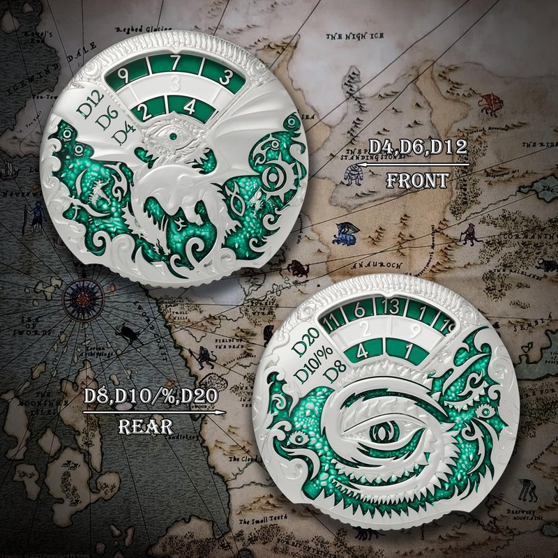- Dragon 7-in-1 Spinner Dice:There are 6 different sets of numbers on both sides of the roulette wheel, one side is engraved with D4, D6, and D12, and the other side is engraved with D8, D10, and D12.