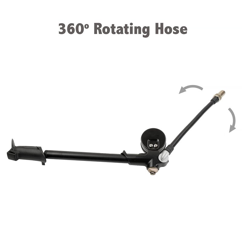DUAL MEASUREMENT INDICATOR: The gauge has PSI or bars measurements for your convenience. The black background and white needle ensure clear and easy reading. Another good feature is that the gauge is also waterproof. 360 degree rotating flexible hose can reach the valve at at any angle.