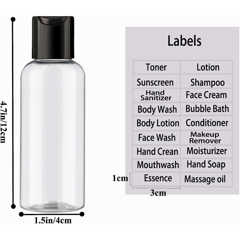 Includes: 5 PCS 100ml/3.4oz mini empty plastic clear travel containers bottles with printed label. Leakproof: Small Plastic Empty Bottles with Black Disc Top Caps - Screw on Design,easy to dispense,and leakproof. Clear bottle body helps recognize what’s inside for quick selection easily. Travel Essentials Accessories: These refillable reusable cosmetic bottles are perfect for storing your lotion, shampoo, or other diy beauty liquid products. compact and practical, convenient to carry for travelling.They are Airline approved, no issues at the airport.
