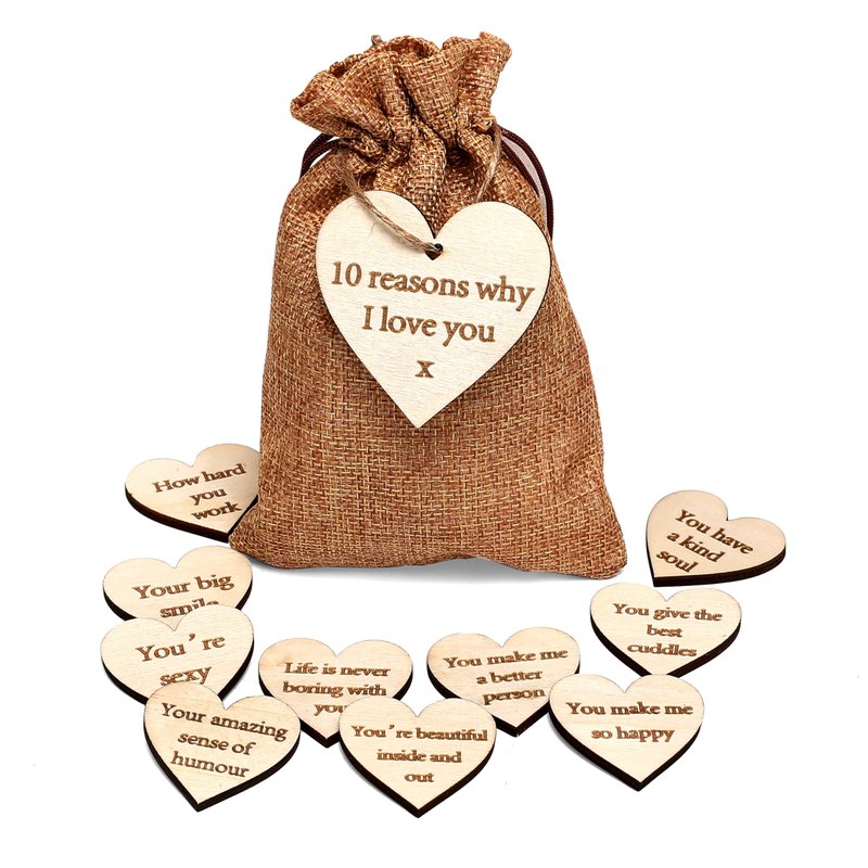 - RUSTIC CHARM - packaged in a rustic hessian drawstring bag, this romantic keepsake is both stylish and sentimental. The bag is adorned with a larger wooden heart reading '10 Reasons Why I Love You x,' making it not only a meaningful gift but also a charming decorative piece for the home. The warm, natural wood and rustic textures add a cosy, heartfelt vibe to your present