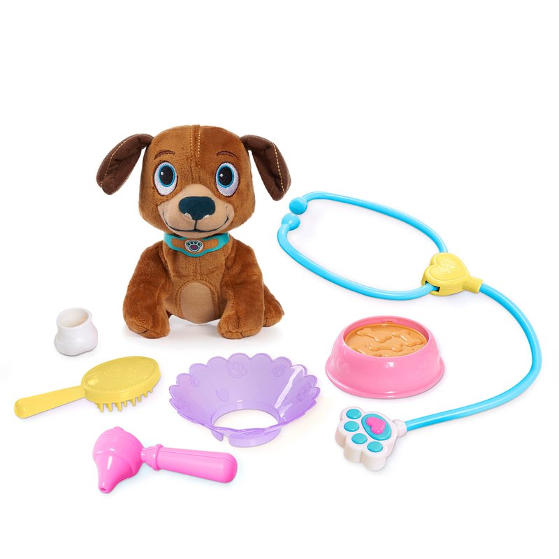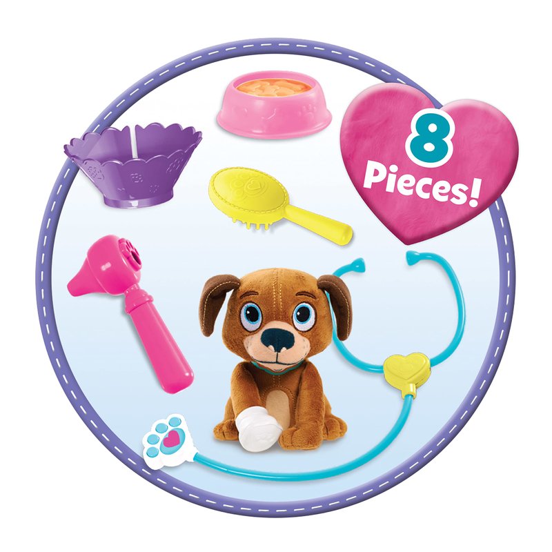 - Includes: carrier, Findo plush toy, paw cast, play stethoscope, play otoscope, pet brush, cone collar, and bowl.