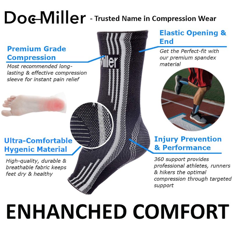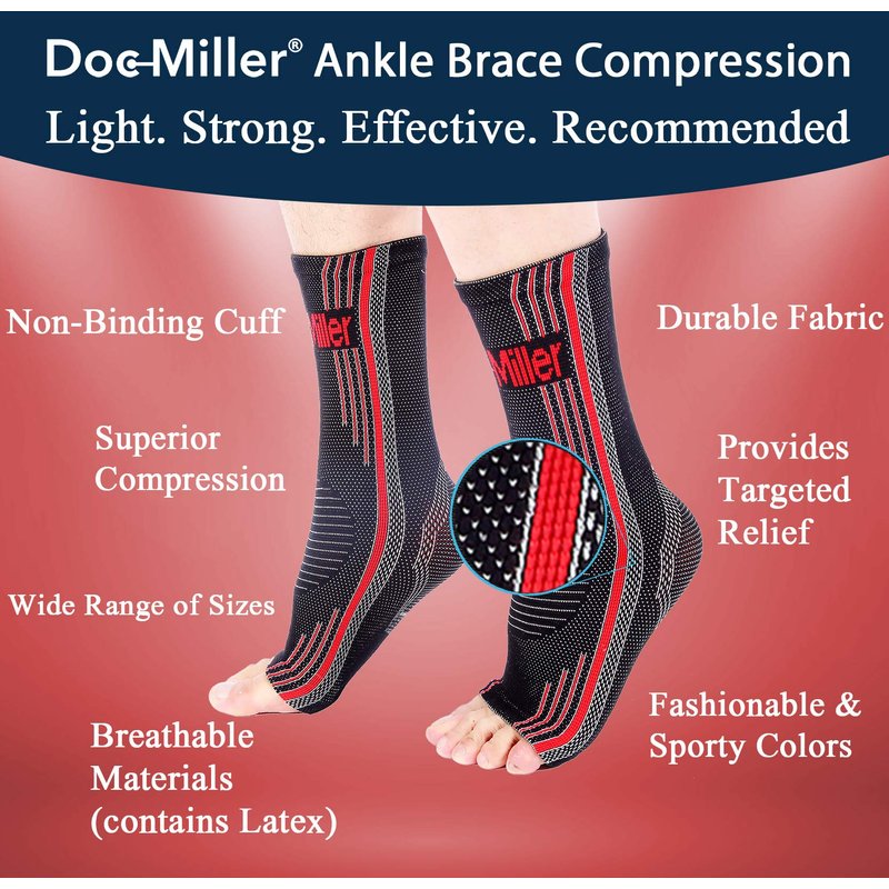 Doc Miller Ankle Braces for Men & Women for Sprains & Sports Injuries Doc Miller ankle compression sleeves are designed to increase blood flow, reduce swelling, and promote pain relief. With these sleeves you will experience less foot pain, faster recovery from injury or exertion, as well as better support for chronic conditions such as plantar fasciitis and achilles tendonitis. SPECIFICATIONS Brand: Doc Miller Size: Small-XXL Gender: Unisex Material: latex Design: Sleek & Discreet Age Range: Adult Use for: Ankles, Feet Uses: Tendinitis, Swelling, Ankle Sprain, Arthritis, Plantar Fasciitis HIGH QUALITY MATERIAL: An ankle brace is made of high-quality breathable quick-drying material that provides comfort all day even with the most active lifestyle. Unique sleek and discreet design keeps your feet dry and cool, perfect for sporting activities including running, basketball, volleyball, soccer, golf, etc. Wear your ankle brace all day at the office, gym, or home. BREATHABLE & LIGHTWEIGHT: A breathable and lightweight foot brace for plantar fasciitis perfectly fits in any of your favorite running shoes. An ankle brace wraps your ankle with compression to keep swelling to a minimum and allow injuries to recover faster. Great for pain relief from sprained ankles, swelling, plantar fasciitis, and more.