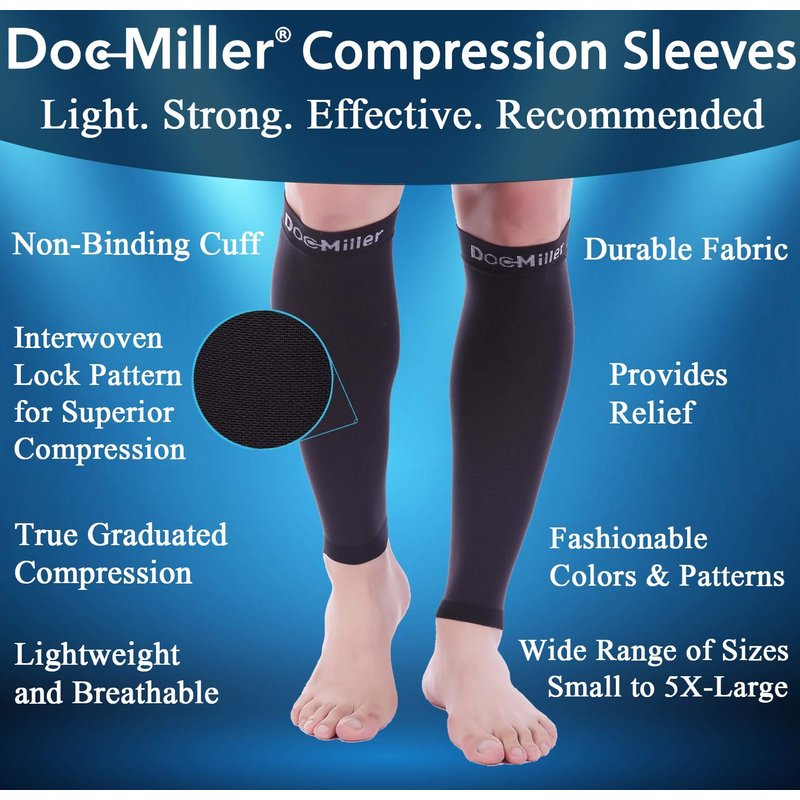 - Doc Miller compression calf sleeves men 30-40 mmHg provides targeted support to ligaments, tendons and calves, speed up the recovery from muscle strain, leg cramps, edema and varicose veins.