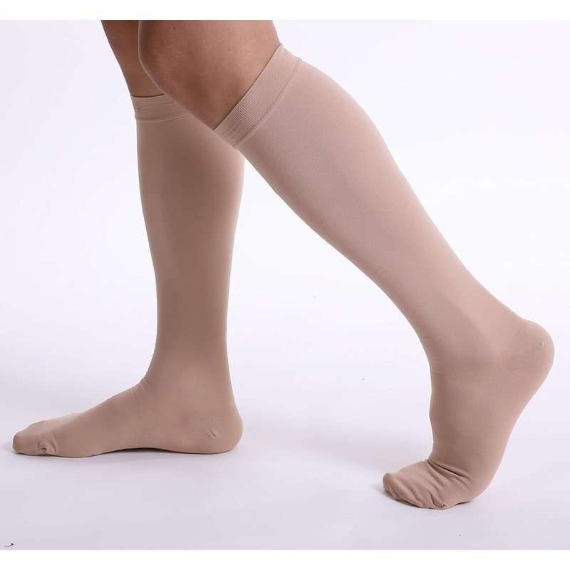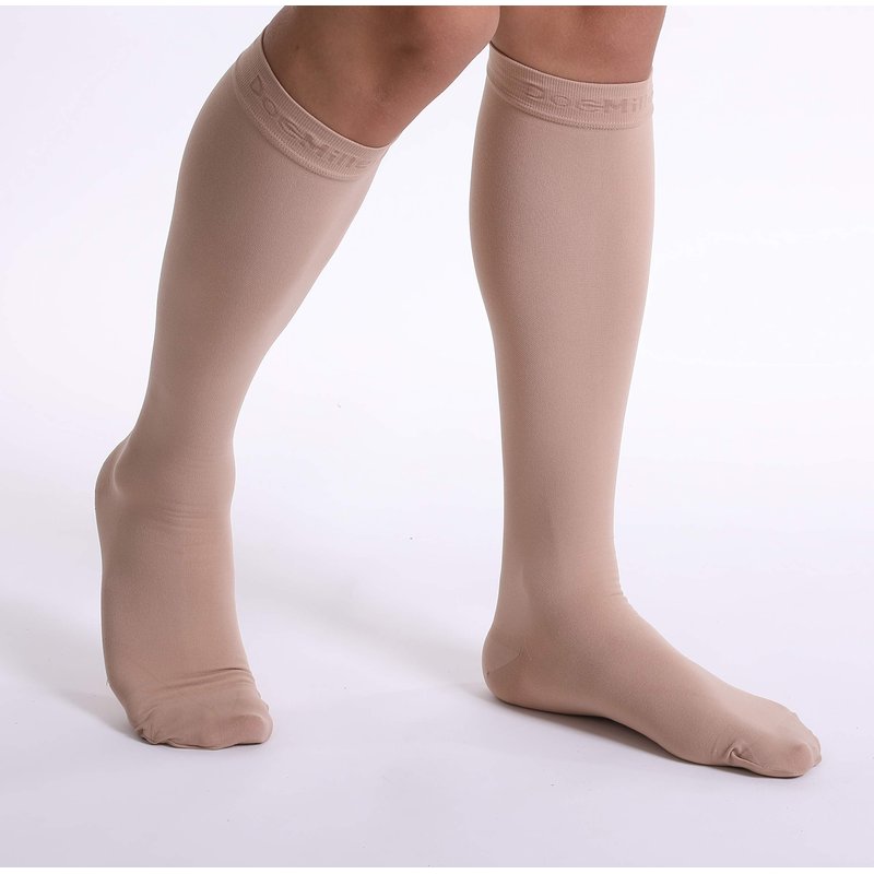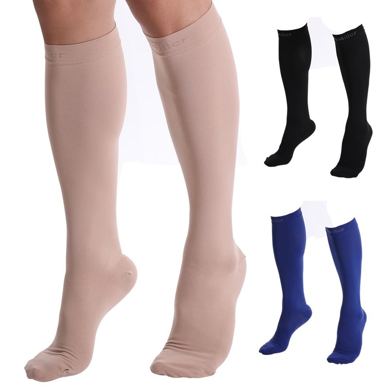 Doc Miller compression stockings for men are made of premium quality Nylon which provides medical grade graduated compression of 15-20mmHg. Specially designed and tested to provide relief from varicose veins, plantar facilities, shin splints, and recovery from calf, ankle, and foot muscle injuries. Our ladies compression socks are working best as pregnancy socks, post-surgery compressions, nurse compression socks. Our 15-20mmHg closed toe compression socks are available in Black and Beige colors in different sizes. We at Doc Miller always strive to provide you with great products that provide the required compression, pain relief, results, and comfort you are looking for. We have a wide variety of compression socks, you can get knee-high compression socks, thigh high stockings, toeless compression sleeves, elbow braces, ankle sleeves, and calf sleeves in different colors, sizes, plus sizes, compression and patterns.