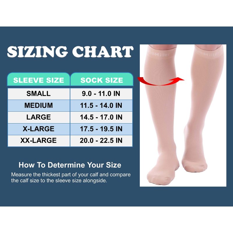- Doc Miller compression stockings are made of premium quality nylon and spandex fabric. Our 15-20 mmhg compression stockings are durable, lightweight and machine washable. For a perfect fit, follow the sizing chart in the images.