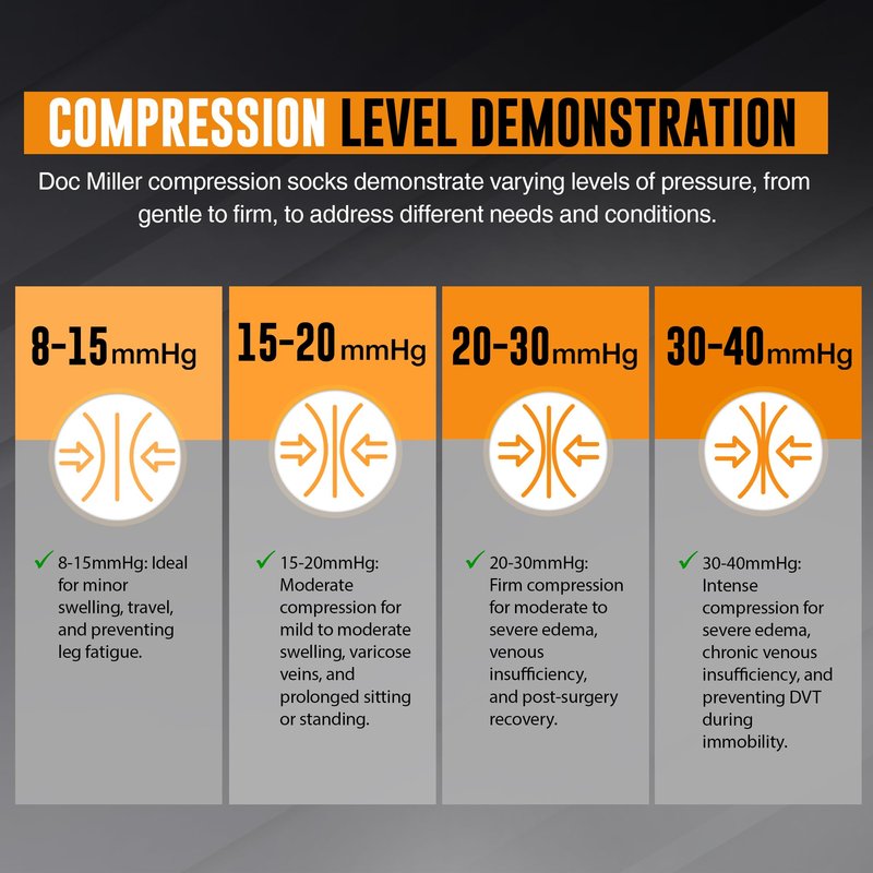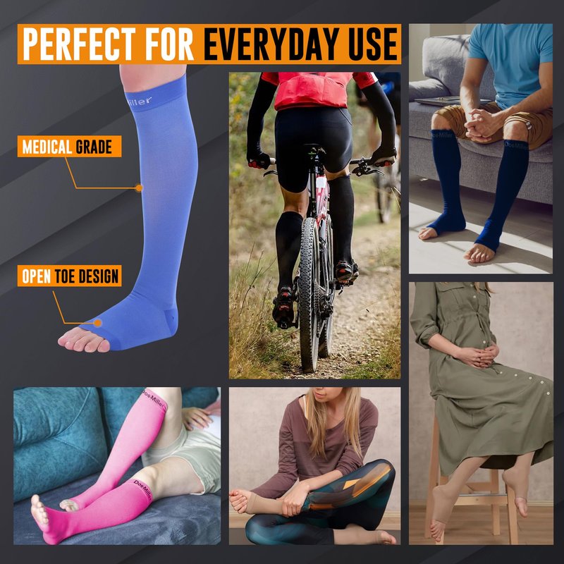 Discover unparalleled comfort and therapeutic benefits with Doc Miller Toeless Compression Stockings for Women and Men. Engineered with washable Nylon material, our medical-grade compression socks offer superior support and relief for various conditions, including calf and shin splints, spider and varicose veins, plantar fasciitis, and edema. Whether you're a dedicated athlete seeking enhanced muscle recovery or a hardworking professional in need of all-day comfort, our open-toe compression socks are your ultimate solution. Designed to promote circulation and alleviate discomfort, these compression stockings are perfect for pregnant women seeking relief from swelling and discomfort. Crafted with precision and care, they provide a snug yet comfortable fit, allowing for unrestricted movement throughout the day. Ideal for use with sportswear for added protection and strength, these socks are also a go-to choice for individuals with jobs that demand long hours on their feet. Choose from a wide array of colors and compression strengths to match your style and preferences. Whether you're looking for subtle neutrals or vibrant hues, our selection has something for everyone. With compression strengths ranging from 20-30mmHg, you can select the perfect level of support to meet your needs. At Doc Miller, we're committed to providing you with products that deliver exceptional results and unparalleled comfort. Our comprehensive collection includes not only open-toe compression socks but also full-length compression socks, thigh-high stockings, toeless compression sleeves, elbow braces, ankle sleeves, and calf sleeves. Available in various sizes, colors, and patterns, our products cater to diverse needs and preferences. Experience the difference with Doc Miller's open-toe 20-30mmHg compression stockings and discover the ultimate relief and support you deserve. Invest in your well-being today and elevate your comfort and performance with our compression solutions.