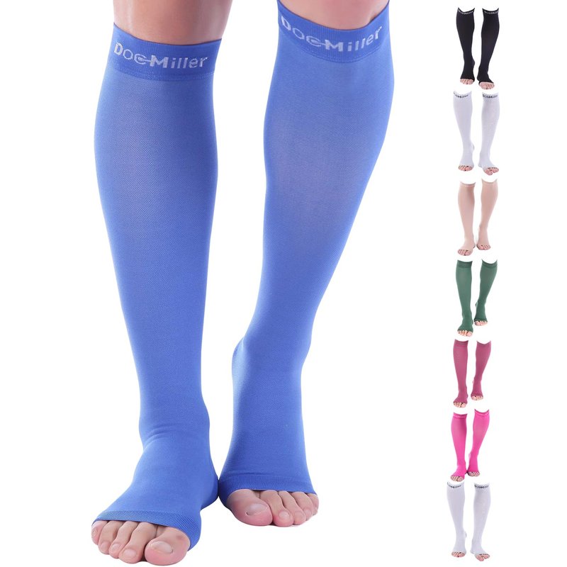 Doc Miller Open Toe Compression Socks, 20-30 mmHg, Toeless, Support Circulation, Shin Splints, Calf Recovery, Post Op, Knee High, Medical Grade, Blue Socks, Small Size for Men & Women, Pair
