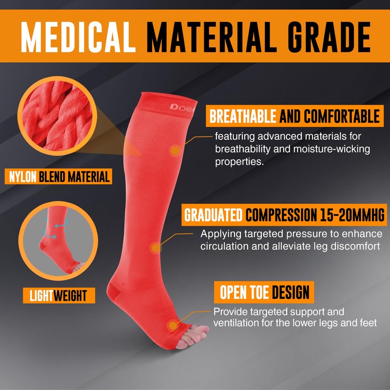 - COMFORT-ENHANCED MEDICAL GRADE COMPRESSION SOCKS: Experience unparalleled comfort and support with our meticulously crafted open toe compression socks. Made from high-quality nylon and spandex fabric, they offer breathable relief for conditions like calf and shin splints, varicose veins, and muscle soreness. With a diverse range of sizes and colors, find the perfect fit for lasting comfort throughout the day.