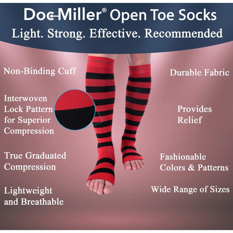 Doc Miller open toe compression socks women and men are nylon material woven toeless socks made for relief from calf strains, shin splint, spider and varicose veins. Lightweight, breathable and durable socks are suited for nurses, doctors during pregnancy and outdoor workers, or you can use them in sports such as running, football, volleyball, weightlifting or gym workout. These open toe compression socks are specially designed to provide you strength, comfort and elegant colorful and cute compression socks. We at Doc Miller value your money and always strive to provide you with great products that bring the required compression, pain relief, results, and comfort you are looking for. We have a wide variety of compression socks, you can get full length compression socks, thigh high stockings, toeless compression sleeves, elbow braces, ankle sleeves, and calf sleeves in different colors, sizes, plus sizes, compression and patterns. Get knee high compression socks of your favorite color and design at Doc Miller