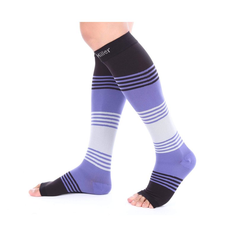 Doc Miller Toeless Compression Socks for Women and Men are designed for recovery from calf, shin splint, spider and varicose veins. These open toe compression socks for men and women may provide pain relief for sore muscles, plantar fasciitis and edema. We are using premium quality washable Nylon material to give you medical grade compression socks for women and men, a perfect use in pregnancy, with sportswear for protection and strength and for those who have to stand long on the job. These open toe socks have sleek design, which makes them wearable for daily use or for any special occasion. Select from a wide range of colors and compression strengths. At Doc Miller we always strive to provide you with great products that bring the required compression, pain relief, required results and comfort you are looking for. We have a wide variety of compression socks - you can get full length compression socks, thigh high stocking, toeless compression sleeves, elbow braces, ankle sleeves, and calf sleeves in different colors, size, plus size, compression and patterns. Get the open toe 20-30mmHg compression socks for the ultimate relief.