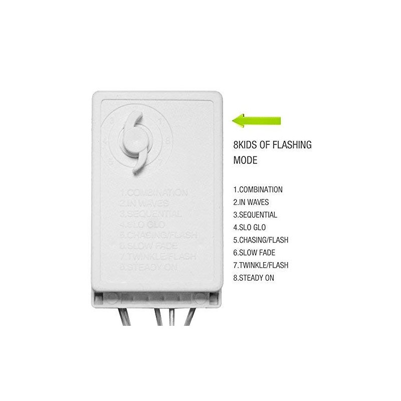 - 8 different modes of glimmering--You can press the button on the plug to change the lighting modes,Combination, In waves, Sequential, Slo-Glo, Chasing/Flash, Slow fade, Twinkle/flash and Steady on.