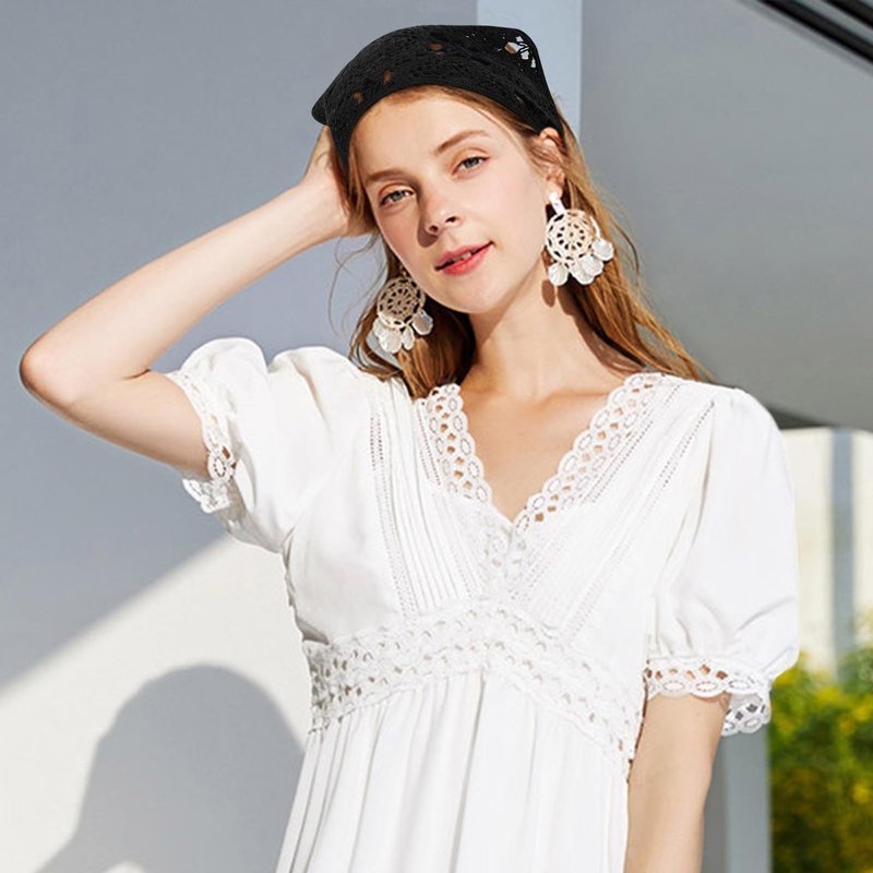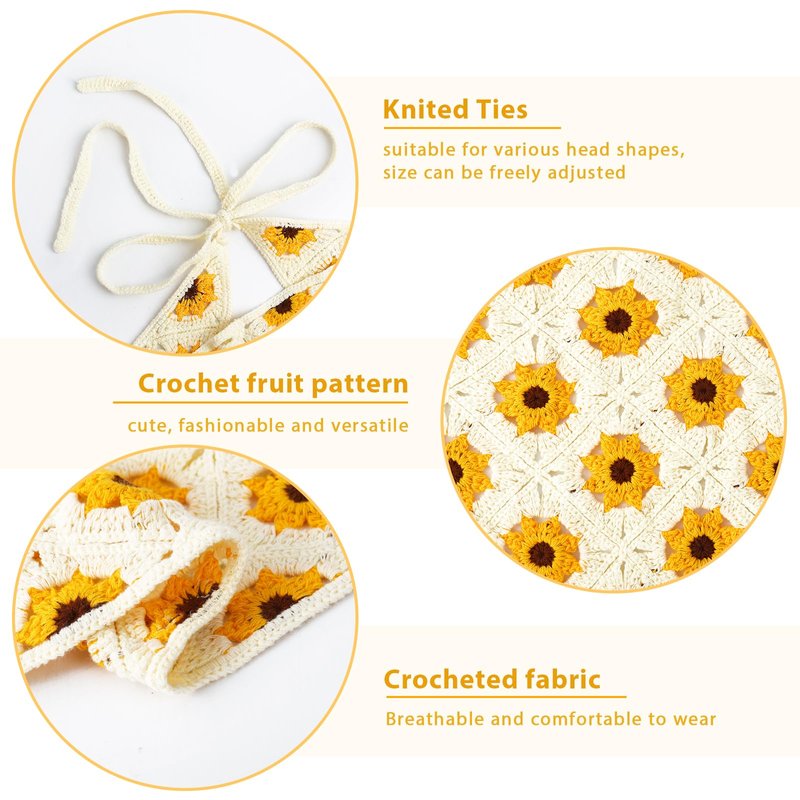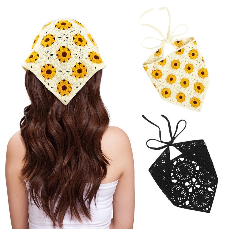 DOCILA Crochet Hair Bandana For Women Retro Lace Neckerchief/Aesthetic Sunflower Head Scarf Knitting 70s 60s Costume Headbands Scarves Black Beige Yellow