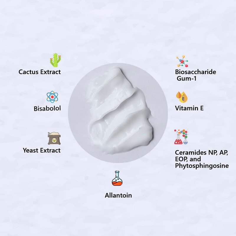 - 🍂{INGREDIENTS} Cactus extract is light and absorbs well. This extract includes large amounts of linoleic acid, Biosaccharide Gum-1 A moisturizing and skin soothing ingredient. Vitamin E works to block free radicals from the body, Bisabolol is a resin obtained from Chamomile that reduces inflammation & softens fine lines. Ceramides NP, AP, EOP, and Phytosphingosine are naturally occurring long-chain lipid that works to hydrate. Yeast Extract & Allantoin provide unparalleled hydrating.