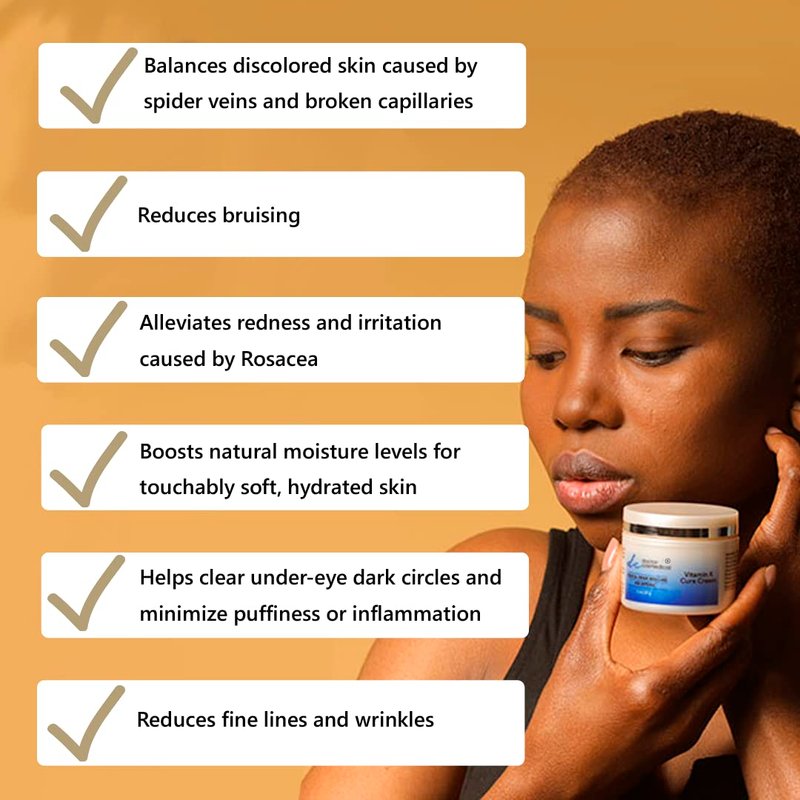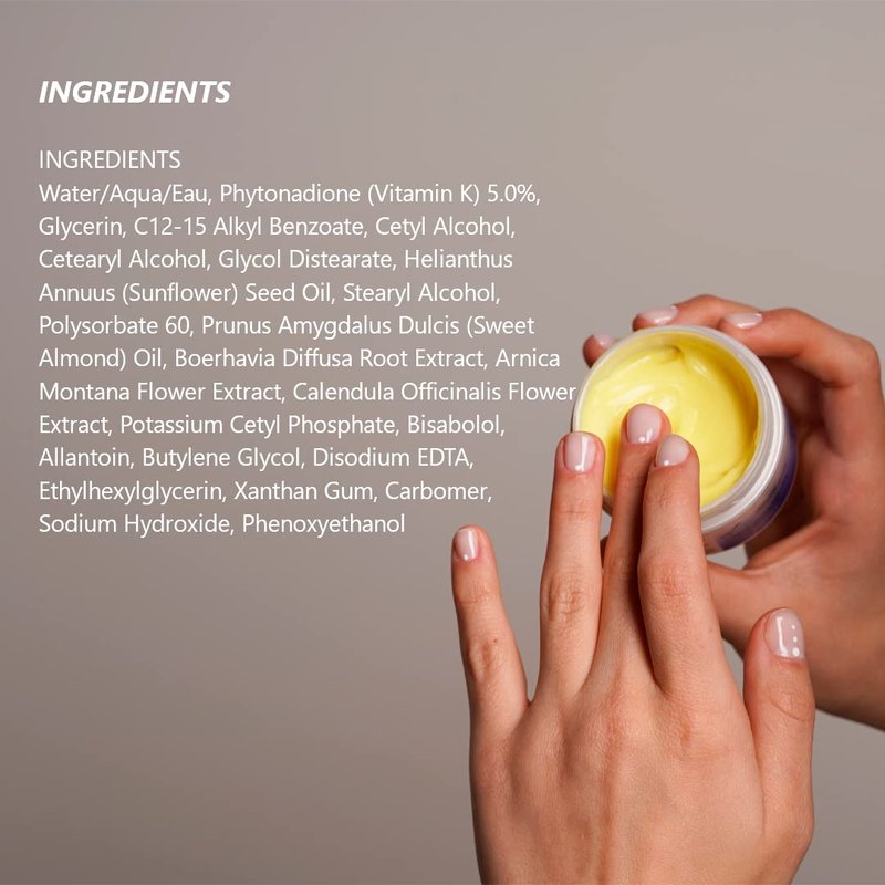 - π [FORMULATION] This vitamin k face cream contains Vitamin K 5%, Sunflower Oil, and Sweet Almond Oil which helps to fade and clear bruising, and improve the appearance of discolored skin caused by spider veins and broken capillaries. A perfect vitamin k skincare daily use cream.