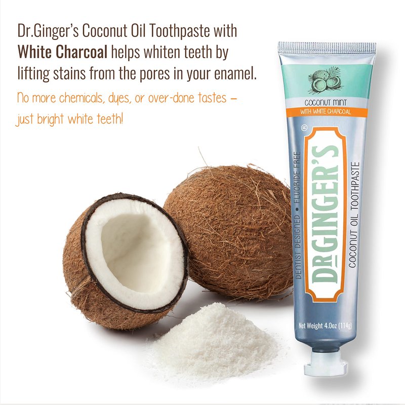 - DR. GINGER'S WHITE CHARCOAL TOOTHPASTE A premium one of a kind toothpaste, made with organic Coconut Oil and Xylitol that tackles oral care in whole new way. The white activated charcoal provides teeth with extra whitening power for a sparkling smile. The delicious coconut mint flavor freshens in the cleanest way. Packaging includes a 4oz tube, 2ct